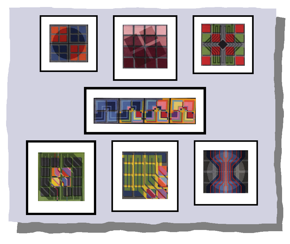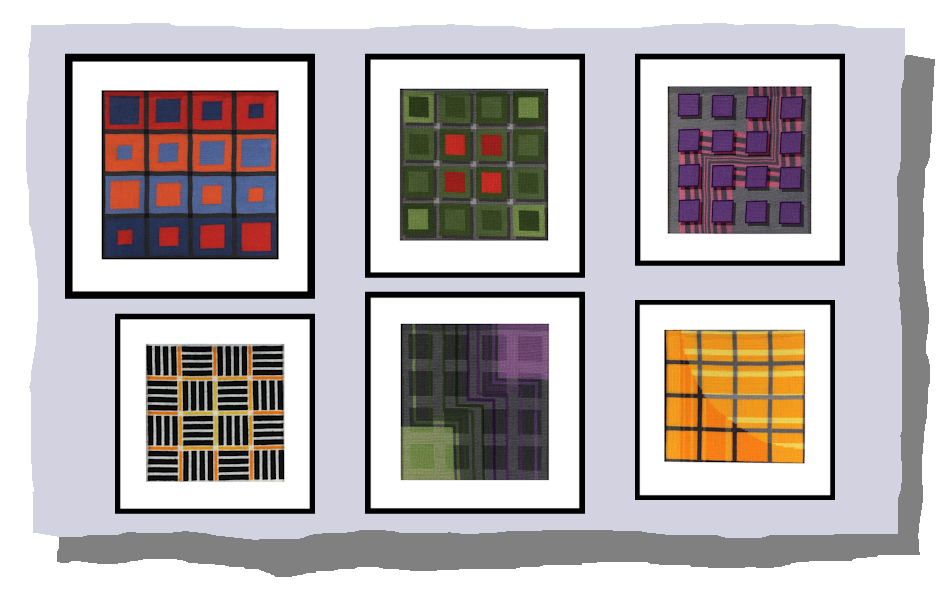 After doing a simple design based on complementary colours (Tapestry 6), I also began to experiment with raising the squares off the canvas by adding shadows behind them…