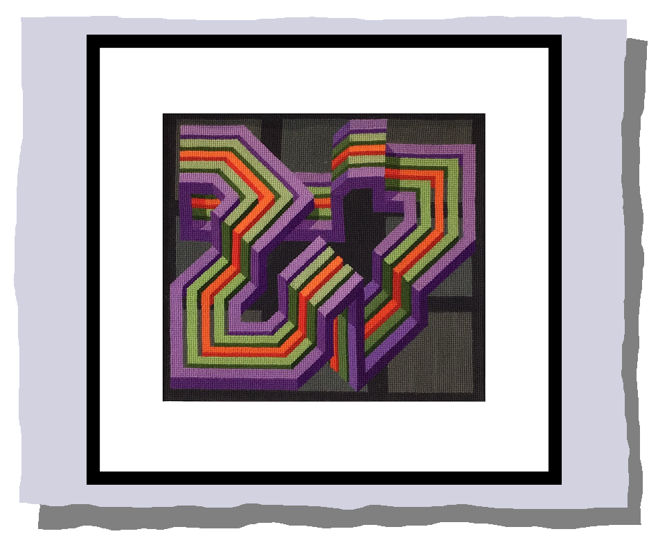 Here we have a Möbius strip, a form with one face, and one edge. It has no upper or lower faces, or inner and outer edges. The design comprises a single band of mauve, a single band of green, and a single band of orange. Trace around with your finger if you don’t believe me!
